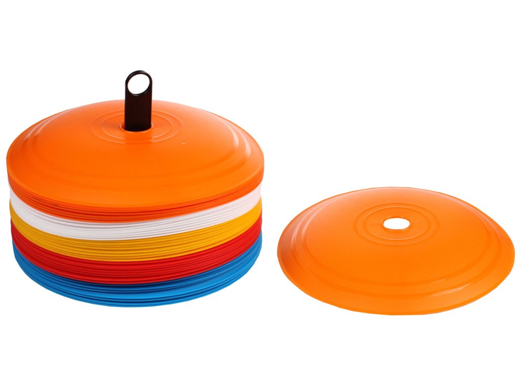 Vytyčovací mety Flat Disc s průměrem 23 cm a výškou 25 mm jsou vyrobené z odolného plastu a jsou vhodné pro tréninky v tělocvičně i venku. Díky různým barvám lze z met vytvořit pestrou a nápaditou dráhu. Sada je složená ze čtyřiceti kusů pěti různých barev. Součástí je také plastový stojánek pro snadné přenášení a uskladnění mezi jednotlivými tréninky.