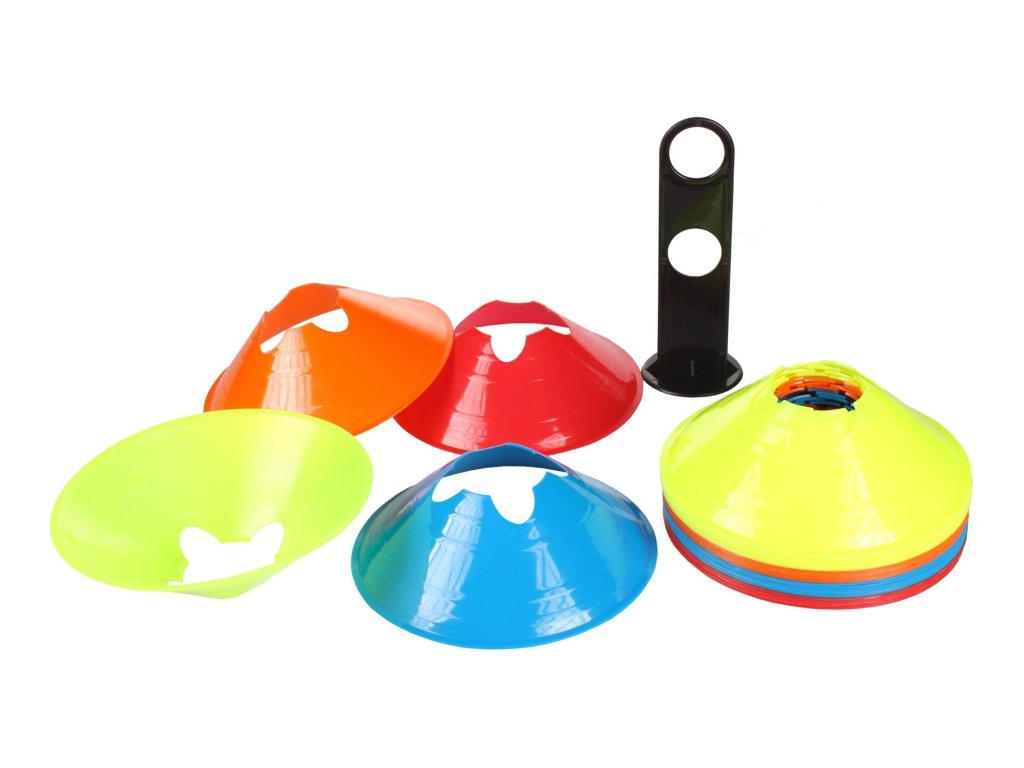 Vytyčovací víceúčelové mety Jumbo s průměrem 19,5 cm a výškou 5 cm jsou vyrobené z měkčeného plastu a jsou tak odolné proti prošlápnutí nebo jiné deformaci. Díky různým barvám lze z met vytvořit pestrou a nápaditou dráhu. Do výřezů na vrcholu lze vložit tyčky s průměrem 25 mm a postavit tak na dráze i překážky. Sada obsahuje 32 met rovnoměrně rozdělených do 4 barev a plastový stojánek pro jejich snadné přenášení.