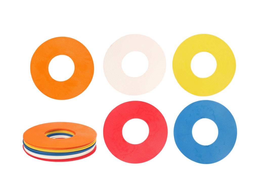 Značka na podlahu Merco Flat Ring je praktická cvičební pomůcka, díky které vytvoříte během chvilky tréninkovou dráhu dle svých představ. Tato sada se skládá z dvaceti kruhů vyrobených z elastické termoplastické gumy (TPR), s vnějším průměrem 19 cm, vnitřním průměrem 8 cm a hmotnost jednoho kruhu je přibližně 60 g. Díky použitému materiálu jsou značky vhodné pro venkovní tréninky i do tělocvičen. Sada je zabalena v praktické polyesterové síťce se stahováním na šňůrku.